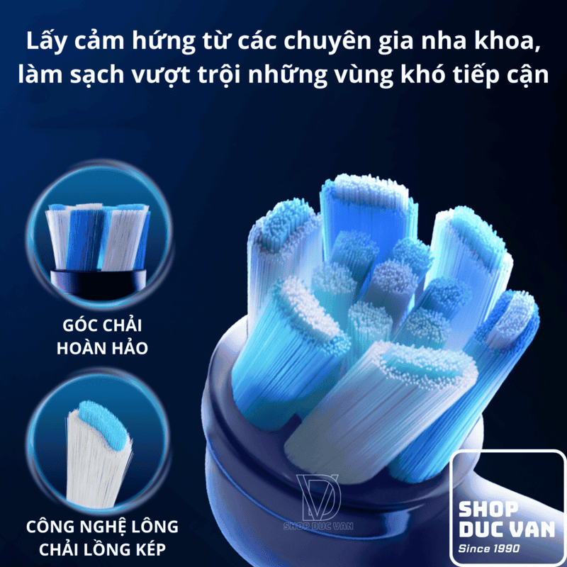 - Cấu Trúc Lông Chải Lồng Kép: Các chùm lông nhỏ được lồng tinh xảo bên trong các chùm lông lớn hơn. Cấu trúc độc đáo này giúp tập trung lực làm sạch, đánh bay các mảng bám cứng đầu một cách hiệu quả.