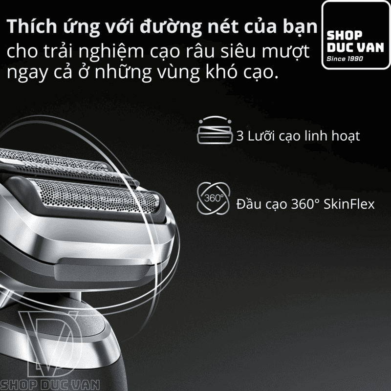 - Công Nghệ 360° SkinFlex: Đầu cạo được trang bị đầu cạo 360° SkinFlex và 3 Lưỡi cạo linh hoạt (3 Flex Blades). Công nghệ này cho phép đầu cạo thích ứng hoàn hảo với mọi đường nét trên khuôn mặt bạn, từ hàm, cằm đến dưới mũi, đảm bảo cạo sạch tối đa ngay cả ở những vùng khó tiếp cận nhất.
