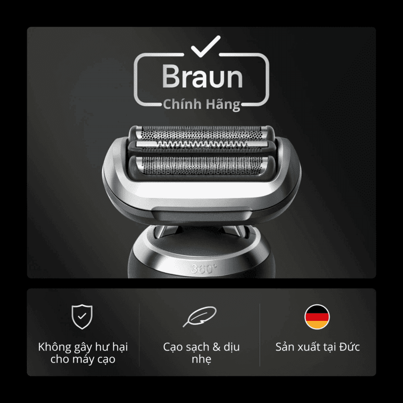 - Hàng "Made in Germany": Sản phẩm được sản xuất 100% tại Đức, đảm bảo chất lượng, độ bền và sự an toàn tuyệt đối. Chỉ sử dụng đầu cạo Braun mới đảm bảo không gây hư hại cho máy cạo của bạn.