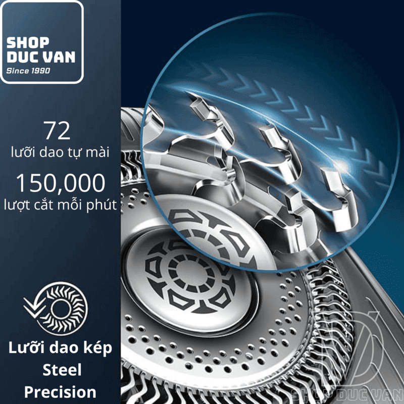 • 72 lưỡi cạo tự mài bén: Được sản xuất tại Châu Âu, hệ thống lưỡi kép DualSteel có khả năng tự mài trong quá trình vận hành, đảm bảo độ sắc bén bền bỉ theo thời gian.