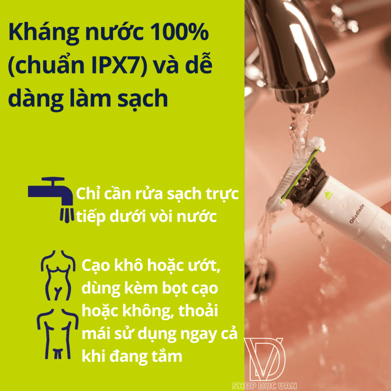 • Kháng nước (IPX7): Dễ dàng vệ sinh dưới vòi nước và thoải mái sử dụng khi cạo khô hoặc cạo ướt với bọt/gel.