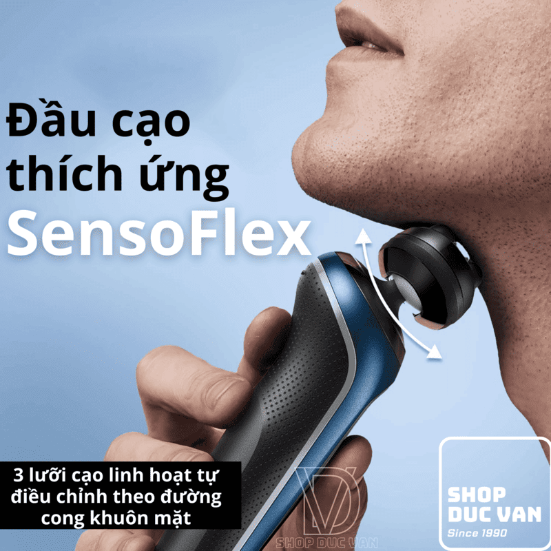 - Công nghệ SensoFlex: Đầu cạo linh hoạt thích ứng và tự điều chỉnh theo mọi đường nét trên khuôn mặt. Thiết kế này giúp giảm thiểu áp lực lên da mà vẫn đảm bảo độ cạo sát tối ưu.