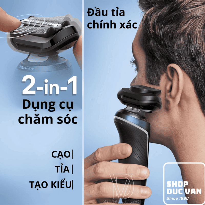 - Đa năng (2-trong-1): Không chỉ cạo râu, với đầu tỉa chính xác đi kèm, bạn có thể dễ dàng tỉa tóc mai, tạo kiểu râu quai nón hoặc râu dê một cách sắc nét.