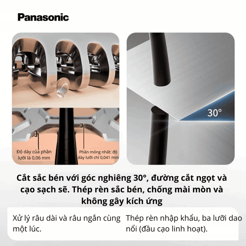 • Góc cắt 30°: Đảm bảo mọi đường cạo đều sắc bén, dứt khoát, xử lý đồng thời cả râu dài và ngắn mà không gây kéo râu hay đau rát.