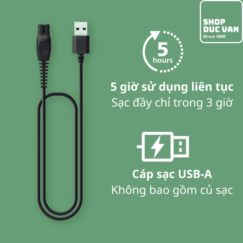 - Sạc: Cáp USB-A (Sạc đầy trong 3 giờ, sạc nhanh 5 phút cho 1 lần tỉa).