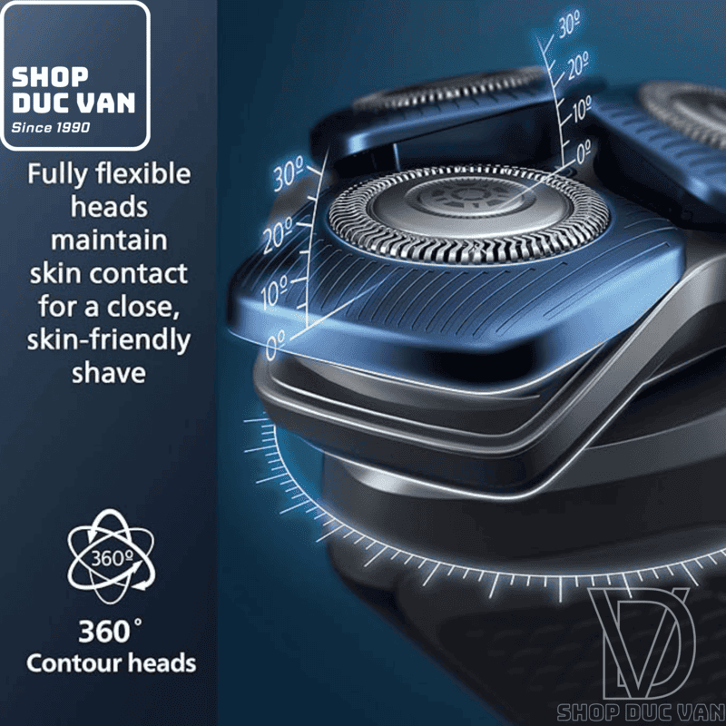 The shaving head is extremely flexible and can pivot 360 degrees. This design allows it to perfectly follow every contour of your face, from your cheeks and chin to your jawline and neck. By maintaining constant contact with the skin, it ensures no hair is missed, even in the most difficult-to-reach areas.